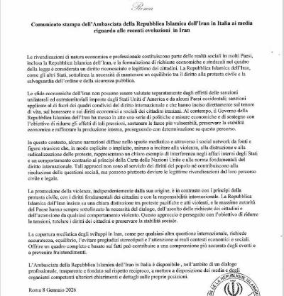 Comunicato stampa dell’Ambasciata della Repubblica Islamica dell’Iran in Italia ai media riguardo alle recenti evoluzioni in Iran