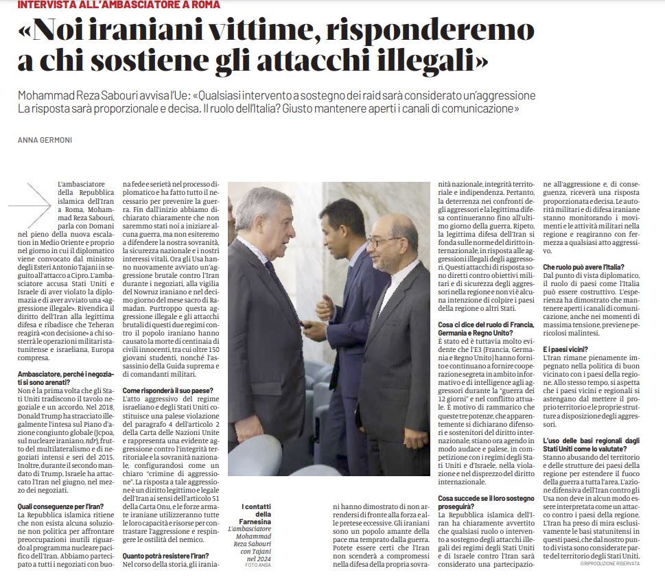 مصاحبه سفیر جمهوری اسلامی ایران در رم با روزنامه Domani.
